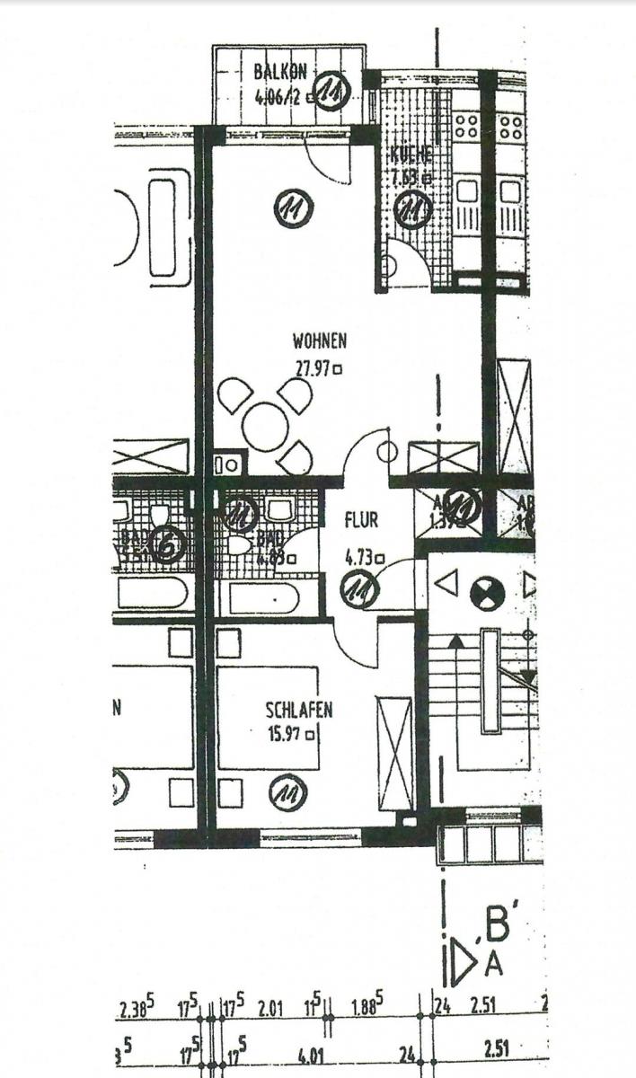 In die zum Verkauf stehende Wohnung im 2. Stock, gelangen Sie durch ein sehr gepflegtes, „aufgeräumtes“ und helles Treppenhaus. Die Wohnung selbst besticht durch eine sehr gelungene Raumaufteilung, und verfügt zudem über einen vier qm großen Balkon nach Westen. Das Wohnzimmer ist 28 qm groß, die angrenzende Küche hat geräumige 7,6 qm.